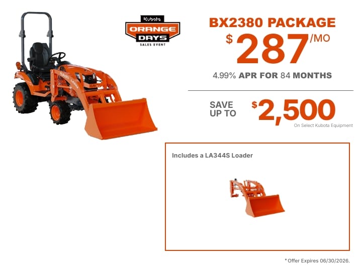 DISCLAIMER Monthly payment shown is based on no money down with 4.99% APR for 84 months. Taxes and applicable fees are not included and may vary based on individual circumstances. Financing is subject to approved credit. Offer valid on in-stock units only. Promotion expires 06/30/2026, but is subject to change without notice. For complete details, visit your local dealer or KubotaUSA.